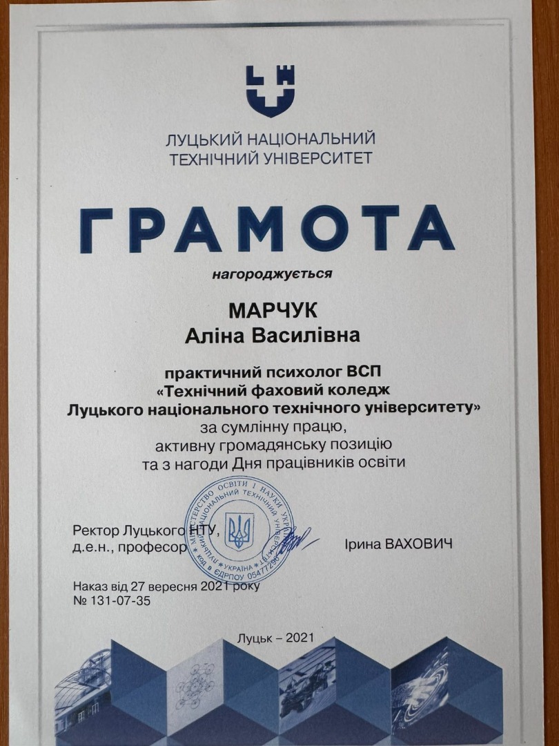 Сертифікат № 232-10/044 від 26.05.2021р., Технічний фаховий коледж Луцького НТУ. Науково-методична конференція «Інтенсифікація навчального процесу на основі впровадження сучасних методів навчання передових новітніх технологій».